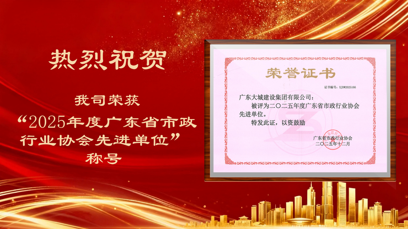 时间记录着奋斗的足迹。2025年12月29日,广东省市政行业协会公布2025年度先进单位评选结果,我司凭借在市政工程领域的综合实力、创新贡献及社会责任担当,荣获“2025年度广东省市政行业协会先进单位”称号。